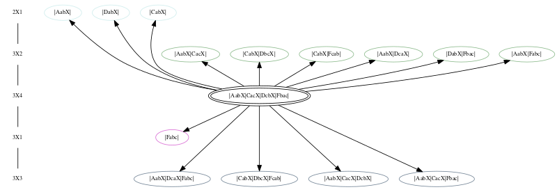 The central, doubly circled model is the child model. The remaining models are its 'parent' models. The child model can be derived from parent models by the addition of one or more reactions. Arrows point from the child model to parent models. Parent models are either open ovals, to indicate non-bistable configurations, or filled ovals, which are bistable. The link from the child model leads to additional information about the model. The links from the parent models traverse the graph.